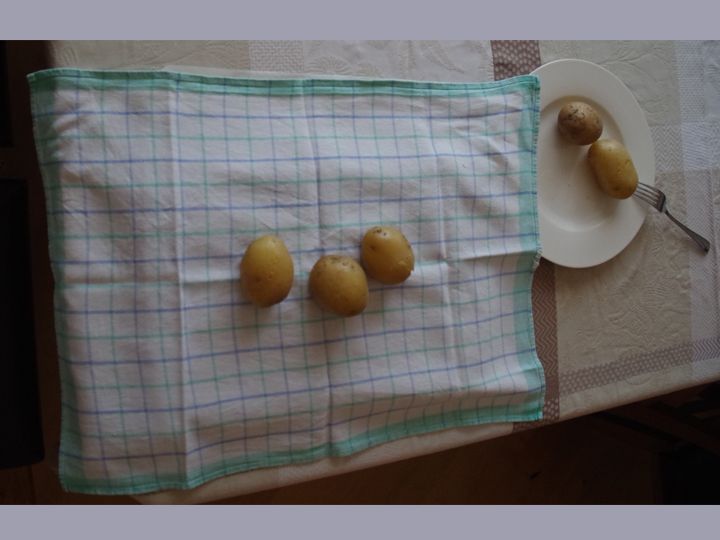 Du brauchst für jeden Wickel 3 Tücher und ½ Kilo (500 Gramm) Kartoffeln. | Koche ½ Kilo (500 Gramm) Kartoffeln weich. | Nimm die Kartoffeln aus dem Wasser und lasse sie etwas auskühlen. |