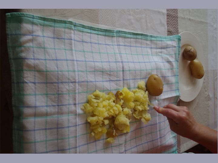 - Lege die Kartoffeln auf ein Geschirr-Tuch und zerdrücke sie mit einer Gabel.