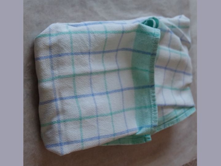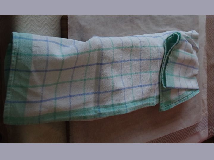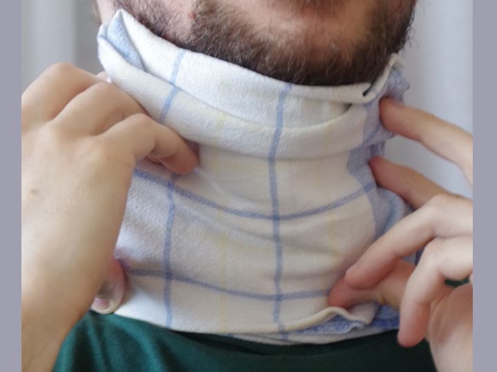 - Lege das Geschirr-Tuch auf den Hals.