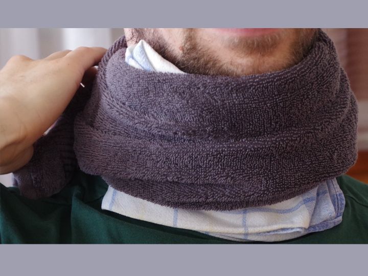 - Lege ein trockenes Hand-Tuch auf den Hals.