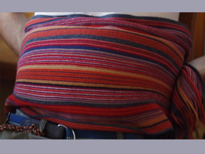 Lege ein trockenes Hand-Tuch darüber. | Lege einen wärmenden Schal oder eine Decke auf den Bauch. |